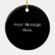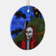 This round ceramic hanging ornament has a grim reaper skeleton in a red hooded cape with a black haunted house and tombstones behind him with bats flying above on a dark blue night sky background. Customize your message on the back with the template.