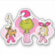 This delightful illustration brings together the full Grinch crew—the Grinch, Max the Dog, and Cindy Lou Who—in a sweet, non-traditional style! The Grinch is front and center with a mischievous smile, sporting a pink Santa hat and polka dot scarf. He's flanked by Max (in antlers) and Cindy Lou Who (in her red bow), both wearing matching pink scarves. The pink heart shapes behind each character emphasize a whimsical, loving, and totally unique holiday (or even Valentine's Day) spirit!