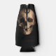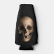 Grinning, creepy skull on bottle cooler. Zipper splits the skulls head right open! Black background.