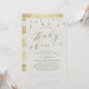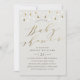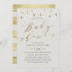 Gris taupe moderne et élégant design d'invitation baby shower avec des gouttes de pluie et de calligraphie à feuilles d'or imitation. Arrière avec des rayures dorées.