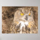 A special gritty texture like image of an Eagle Owl in blended brown, gold, and black, with the bird's big golden eyes in high contrast.