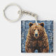 Vibrant artwork depicting a bear with a rich, textured fur coat, set against a patchwork background featuring blue and grey tones. The bear stands imposing and lifelike, capturing attention with its realistic features.