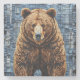 Vibrant artwork depicting a bear with a rich, textured fur coat, set against a patchwork background featuring blue and grey tones. The bear stands imposing and lifelike, capturing attention with its realistic features.
