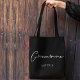 This chic, simple groomsman black tote bag features your name underneath elegant white typography. Customize these elegant, modern bridal party gifts for your wedding groomsmen for the bachelor party.