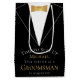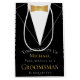 Its upper part suggests a black elegant suit with white shirt and gold bowtie from faux gold foil. In the lower part, the message "Time to suit up" is arched above the message "your service as a Groomsman is requested", with the word Groomsman in bigger caps. The name and the word Groomsman are golden, the rest of the text is white. the background is black.