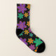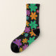 All over print socks in black with groovy 70s style purple, orange, and green flowers.