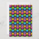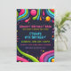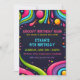 A vibrant and playful birthday invitation featuring a psychedelic, retro-inspired design. The dark background is decorated with colourful, swirling shapes, abstract lines, and vibrant drips of colour reminiscent of the 1970s. The border is a fun pattern of multicolored smiley faces, with stars and bubbles scattered throughout the design. The text is in a mix of bold and playful fonts, with key details highlighted in bright blue and pink.