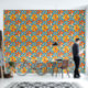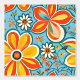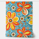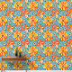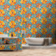 Wallpaper with an illustration of retro flowers in vintage colours blue, yellow and orange giving off a retro mid-century vibe.