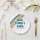 Groovy One Retro Style Birthday party plates with yellow, orange and blue stripes.