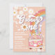 Celebrate your little ones milestone with this groovy retro first birthday invitation! Featuring a pink background with daisies, rainbows, butterflies, and a flower-power van, this playful design brings peace, love, and fun to your party details. Perfect for hippie, boho, or 1960s-inspired themes, this customizable invite sets the tone for a joyful celebration. Guests will love the vibrant colours and nostalgic vibe, making it a standout keepsake for your childs special day.