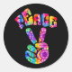 Groovy round sticker features retro style tie dye peace sign hand with curved text on black background. Use as a seal for favour bags, envelopes and gifts.