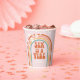 Retro inspired Six is a Vibe 6th birthday party paper cups with hippie style rainbow, daisies and boho fonts and colours.