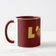 My original artwork on this mug features my created groovy and psychedelic pattern heart in reddish maroon and gold tones, acting as the letter 'O' in the word LOVE. The retro appearance of the letters is designed in a complementary colour hue of golden yellow to the heart and gives this one-of-a-kind mug an artsy flair. The inside and handle of this mug is maroon; however you may change the colour if desired.