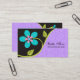 Gros modèle carte de visite de fleurs stylisées turquoise gras. Un design élégant et impressionnant, avec une fleur turquoise audacieuse aux feuilles verts sur arrière - plan noir et violet. Sur le violet il y a un motif damassé. Cliquez sur Personnaliser et choisissez parmi plus de 200 couleurs pour changer la couleur arrière - plan (violet). Idéal pour un fleuriste, des textiles ou pour une carte de profil personnelle.