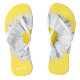 Jolies tongs jaunes et blanches, avec une photo d'une fleur de marguerite blanche et jaune scindée entre les deux chaussons. Personnalisez le texte blanc, sur le pied droit pour répondre à vos besoins.