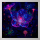 An enchanted bioluminescent scene with translucent forms pulsing in electric blue and magenta light—a magical art print