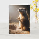 A groundhog stands alert near its burrow while basking in a beam of sunlight filtering through the grass for a birthday.