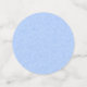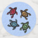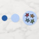 This table confetti has large circles that are light blue with a group of four black turtles with colourful shells in colours of green, blue, red, and yellow. Medium circles are light blue, small circles are dark blue.