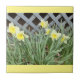 A small “4.25” x”4.25” Ceramic Title ,with a Picture of a Group of Daffodils on it, with a yellow background.