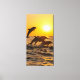 group of dolphins happily leap out of the waves against the backdrop of a golden sunset