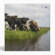 Black and white Holstein cows on a green meadow, grazing and drinking from a brook. Blue sky with traditional Dutch clouds.