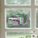 This window cling is a group of Christmas presents wrapped in shiny green and purple paper with pretty bows on top.