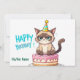 Celebrate birthdays with a humourous twist! This colourful cartoon card features a grumpy cat wearing a festive birthday hat, sitting atop a pink frosted cake with sprinkles. The cat’s piercing blue eyes and unimpressed expression add charm and humour to the design. A playful, slightly messy “Happy Birthday” sign hangs in the background, enhancing the celebratory feel.