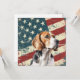 A watercolor portrait of a beautiful Beagle Hound Dog is placed against a grunge background of the USA flag. The back of this all occasion flat card has a text field for you to customize.