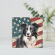 A watercolor portrait of a beautiful Border Collie Dog is placed against a grunge background of the USA flag. The back of this all occasion flat card has a text field for you to customize.