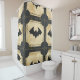 Distressed denim Halloween patchwork shower curtain featuring bats in flight with bold stitches on a cream textured background. A rustic, grunge design ideal for gothic décor, Halloween parties, or unique seasonal gifts.