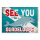 See You In Guadeloupe Caribbean retro dolphin travel design. Charming turquoise vintage style with a cheerful swimming dolphin.
