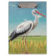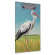 A majestic white stork stands gracefully amidst golden wheat, its sharp gaze surveying the peaceful green meadows beyond. The soft blue sky, adorned with wispy clouds, adds to the serene countryside charm. This artwork captures the harmony between nature and wildlife, evoking a sense of nostalgia and tranquillity.