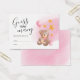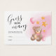 A girl teddy bear baby shower game featuring a simple plain white background, a watercolor bear, pink balloon, gold stars & a babies bottle, and a "guess how many" template that is easy to personalize.