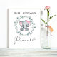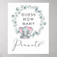 Cute game sign for your baby girl shower with "Guess How Many Peanuts" written simple typography and a stylish script with heart swash and a pink watercolor of a baby elephant in a eucalyptus wreath. Place a jar filled with peanuts underneath and ask your guests to guess how many peanuts are in the jar. The winner will be the guest who gets closest without going over. Matching guess cards are available in our Elephant Eucalyptus Baby Girl Shower Collection.