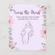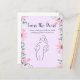This is a printable bridal shower game card titled "Guess the Dress". The design has a light purple background and is framed by a decorative border of pink and white flowers with green leaves. The title is written in a whimsical script font. Below the title, the instructions, "Draw what you think the bride wedding dress will look like," are written in a simple, handwritten-style font. The centre of the card features a simple black-and-white line drawing of a woman in a standing pose, providing a blank canvas for guests to sketch their predictions of the wedding dress.