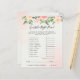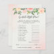 This baby shower game card features beautiful soft pastel watercolor roses and peonies in shades of blush pink and peach with lush green botanical leaves and eucalyptus.