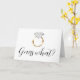 This card says Guess what? on the front along with a gold banded white diamond engagement ring graphic. The inside says “We’re engaged!” Along with custom text to add your own names. A fun way to announce your engagement!