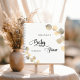 A white background colour. Decorated with elegant golden eucalyptus sprigs. Add a name and a date.