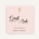 A blush, rose gold background colour, decorated with a golden cross. Add a name and a date. The text: Guest Book is written with a modern hand lettered style script.