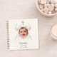 A soft ivory, cream colored background. Decorated with a large white bow with pearls and a golden cross. Personalize and add a photo, the name and date.