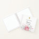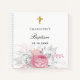 A white background with pink and white florals, silver foliage and a golden cross. Personalize and add a name, and date.