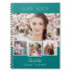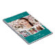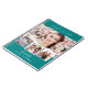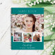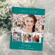 Create your own unique photo collage. Use four, 4 of your favourite photo. Personalize and a name and age/dates. A teal, green background colour, white text.