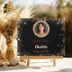 A black background decorated with faux gold diamond photo frame. Faux gold glitter. Personalize and your photo, name and date. Rose gold foil text.