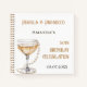 A white background colour. Decorated with a glass of sparkling Prosecco and pearls. Add a name and a date.