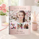 Create your own unique photo collage. Use four, 4 of your favourite photo. Personalize and a name and age/dates. A rose gold, blush gradient background, black text.