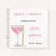 A white background colour. Decorated with a glass of pink sparkling Prosecco and pearls. Add a name and a date.