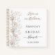 A white background colour. Decorated with wildflowers in beige and cream. Add a name and a date. Text: Love is in Bloom