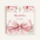A cream, beige background colour. Decorated with a large pink bow and a golden cross and pink flowers. Personalize and add the name and date.