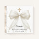 Celebrate her First Holy Communion with this elegant guest book featuring a luxurious ivory bow with delicate pearl details and a subtle gold cross on a clean white background.