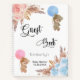 For an elegant and modern baby shower, gender reveal party. A white background. Decorated with light blue, rose gold, pink florals, pampas grass and two teddy bears. One with a blue balloon, the other with a pink balloon.
